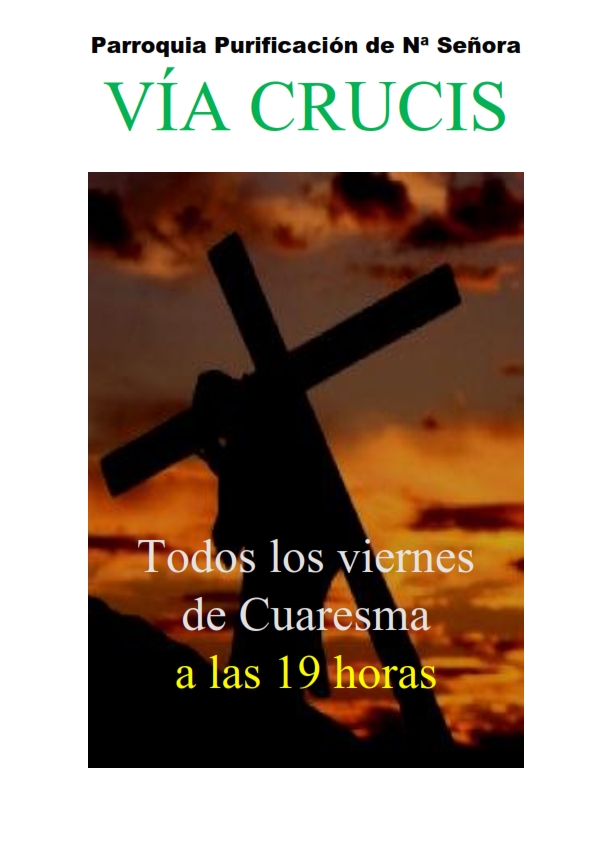 Todos los viernes de cuaresma, para profundizar en el espíritu penitencial de este tiempo, acompañaremos a nuestro Señor Jesucristo en su camino hacia el Calvario. Lo haremos con el rezo meditado del Vía Crucis. Será a las 19 horas, antes de la misa de la tarde. Al tener esta celebración suspendemos el Rosario.